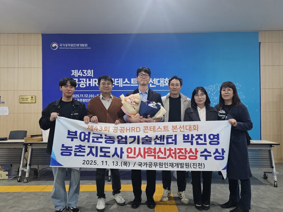 [충청뉴스큐] 부여군농업기술센터는 국가공무원인재개발원이 주관한 ‘제43회 공공HRD 콘테스트’교수 학습 분야에서 박진영 지도사가 ‘인사혁신처장상’을 수상했다고 18일 밝혔다.