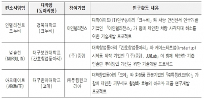 선정된 컨소시엄은 경북대학교의 연구동아리 크누비와 이인텔리전스 기업이 ‘인텔리전트 크누비’로 차량 사각지대 해소를 위한 기술개발을, 대구보건대학교 간호창업동아리와 ㈜줌랩이 ‘널슐린으로 기존 인슐린 투여방법 개선을 위한 기술개발을, 대구한의대학교 창업동아리 코메와 ㈜튜링겐코리아가 아로메이트로 피부세포 활성화 효능의 아로마 제품 연구개발 기술개발을 위한 프로젝트를 수행한다.