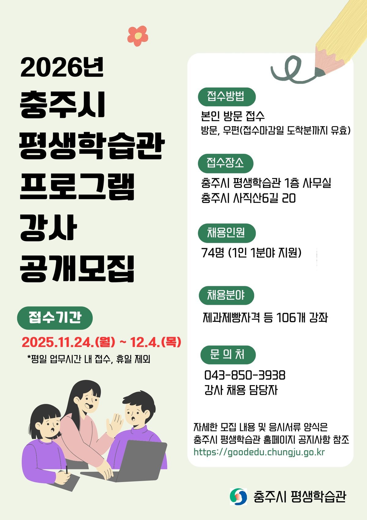 [충청뉴스큐] 충주시 평생학습관은 2026년 한 해 동안 정규 평생학습 프로그램을 담당할 강사 74명을 공개모집한다.