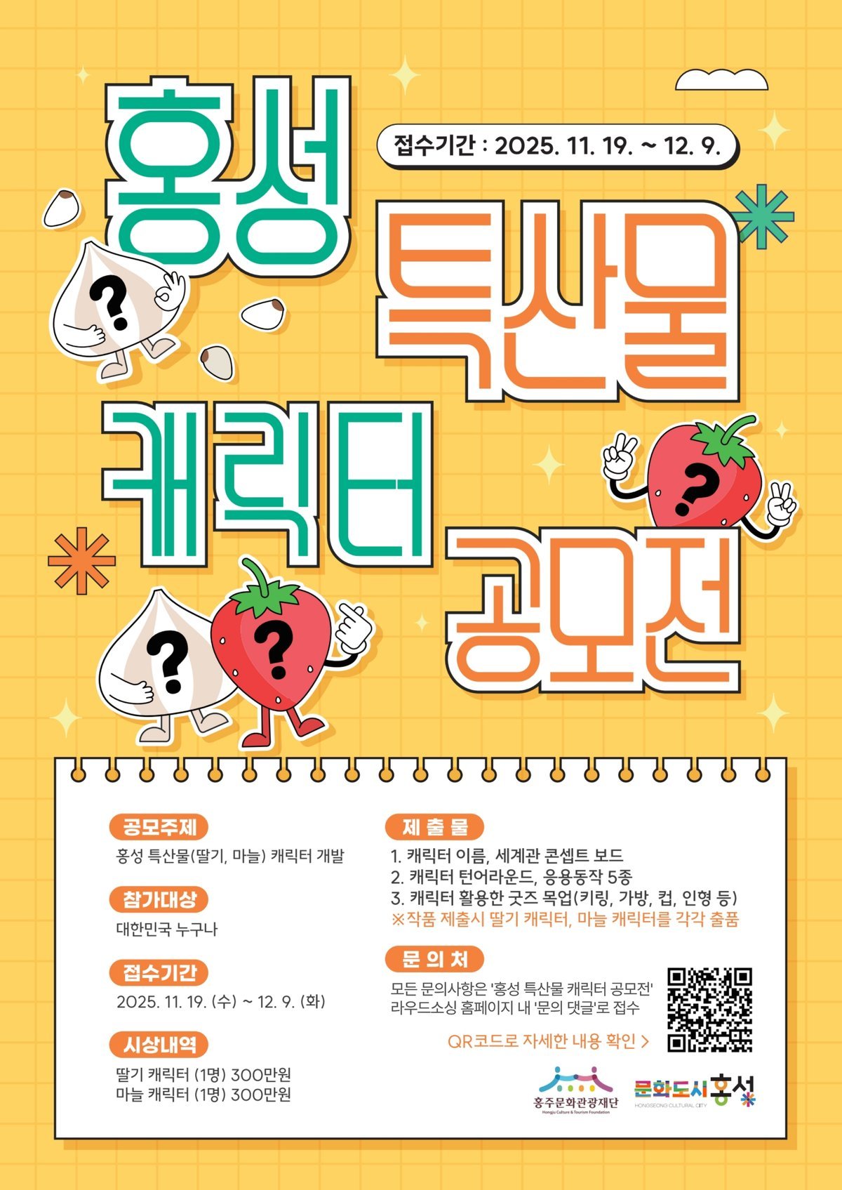 참가자는 딸기 또는 마늘을 모티브로 한 캐릭터 디자인을 제출할 수 있으며, 총 상금 600만 원의 규모로 분야별 우수작을 선정한다. 딸기·마늘 분야 각각 우수작 1명에게 상금 300만원이 수여되며, 최종 선정된 캐릭터는 홍성군 문화관광 홍보 행사와 기념품, SNS 콘텐츠 등 다양한 분야에서 활용될 예정이다.