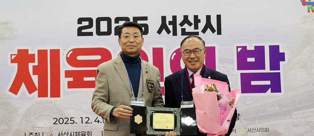 [충청뉴스큐] 서산시의회 조동식 의장이 지난 4일 베니키아 호텔에서 열린 ‘2025 서산시 체육인의 밤’행사에서 서산시체육회로부터 감사패를 전달받았다.