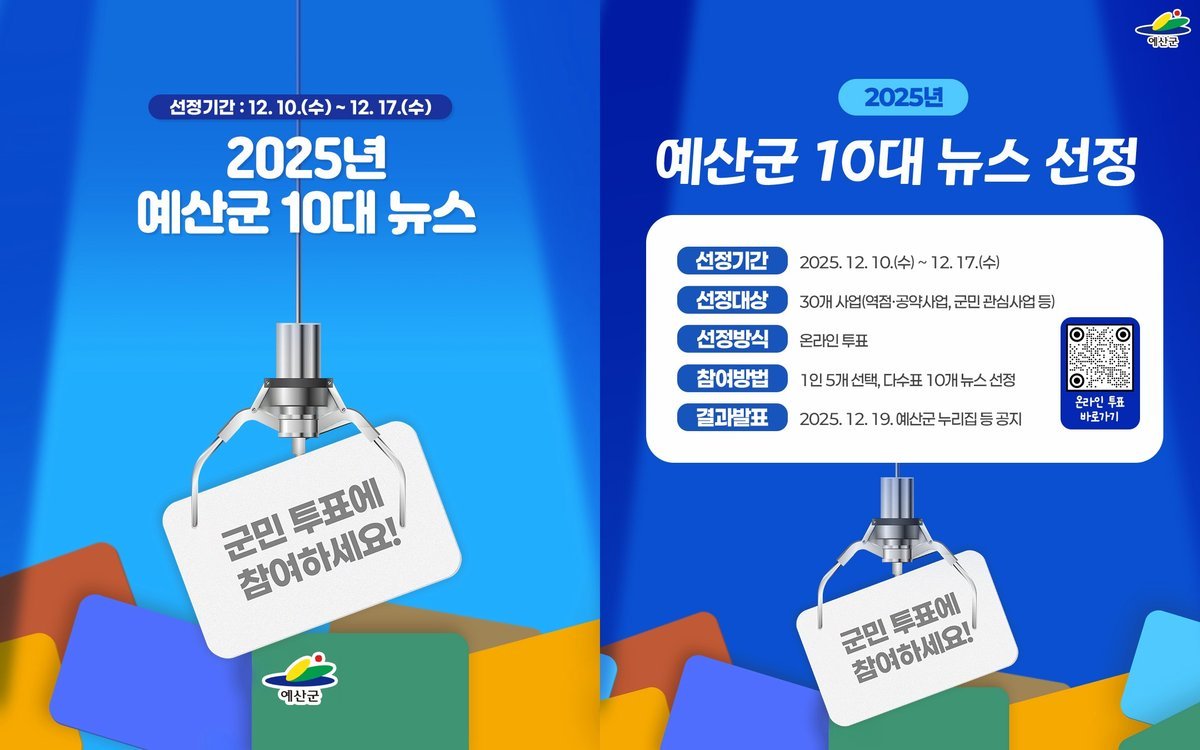 [충청뉴스큐] 예산군은 2025년 한 해를 빛낸 주요 성과를 군민과 직원의 투표를 통해 선정하기 위해 ‘2025년 예산군 10대 뉴스 선정’을 추진한다고 밝혔다.