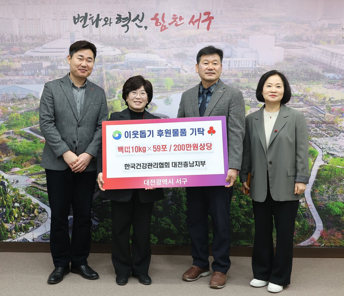 [충청뉴스큐] 대전 서구는 15일 한국건강관리협회 대전·충남지부로부터 백미 10kg 59포를 기탁받았다.