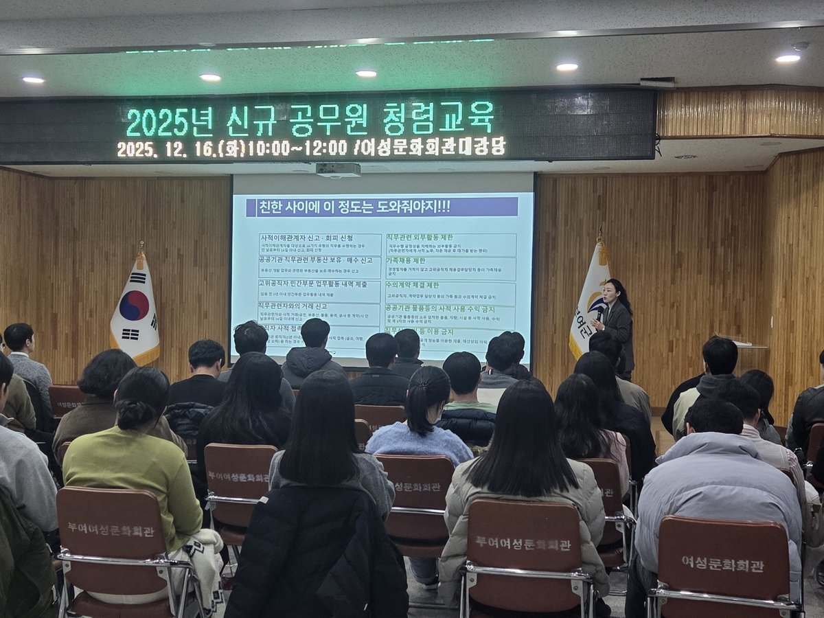 [충청뉴스큐] 부여군은 지난 16일 여성문화회관 대강당에서 신규공무원 60여 명을 대상으로 청렴 교육을 진행했다.
