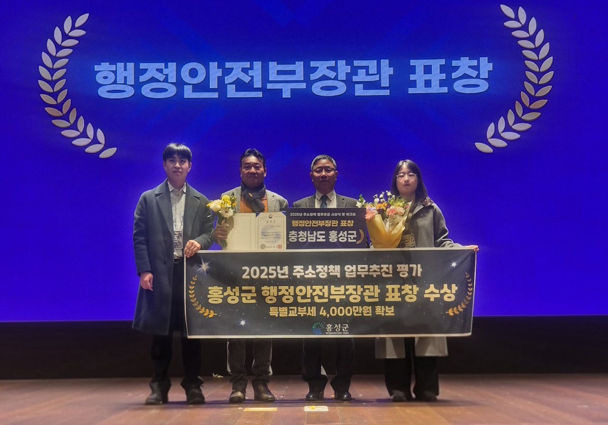 [충청뉴스큐] 충청남도 홍성군이 지난 18일 행정안전부 주관 ‘2025년 주소정책 업무추진’평가에서 2010년, 2015년, 2018년에 이어 2025년에도 우수기관으로 선정되며 지역사회의 도로명주소 활용 및 관리 역량을 한 단계 끌어올린 성과를 인정받아 행정안전부 장관 표창과 특별교부세 4000만원을 받았다고 밝혔다.