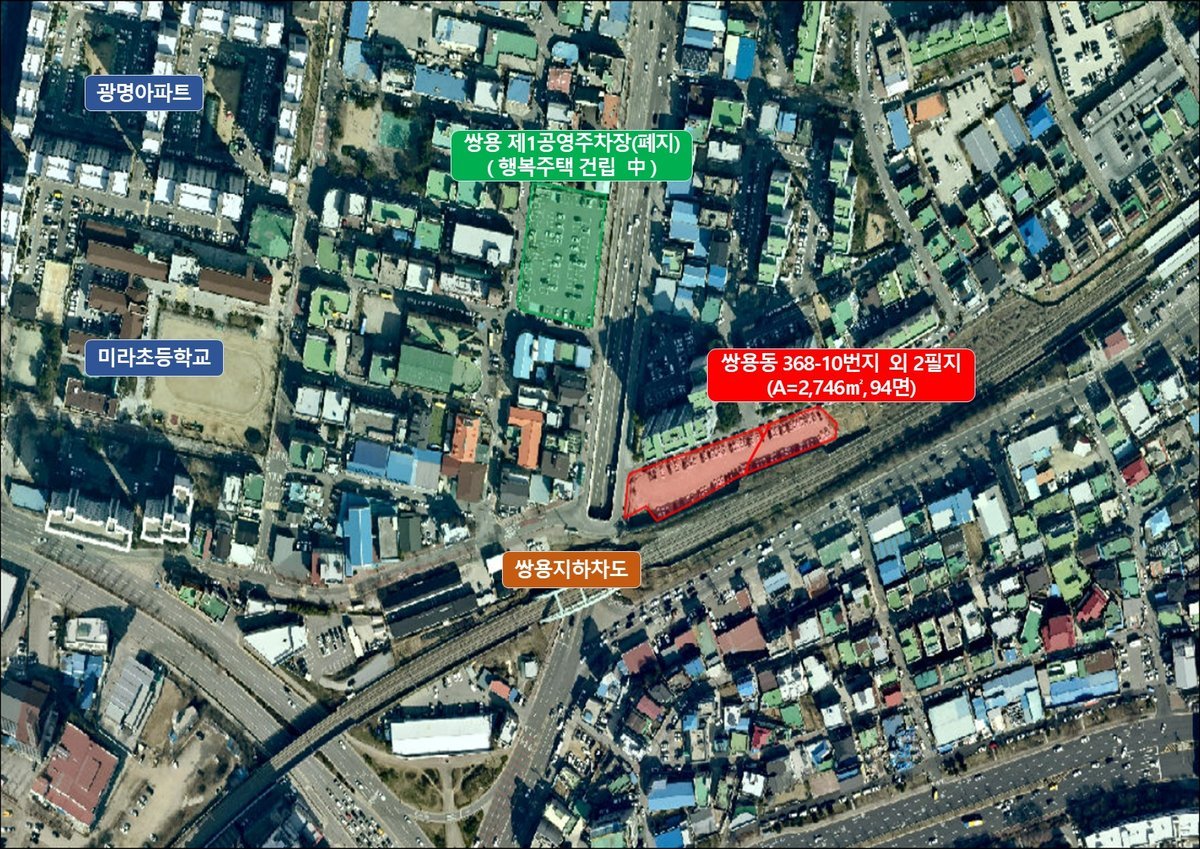 노외주차장은 천안시 서북구 쌍용동 368-10번지 일원 총면적 2,746㎡ 규모에 94면의 주차공간으로 조성됐다.
