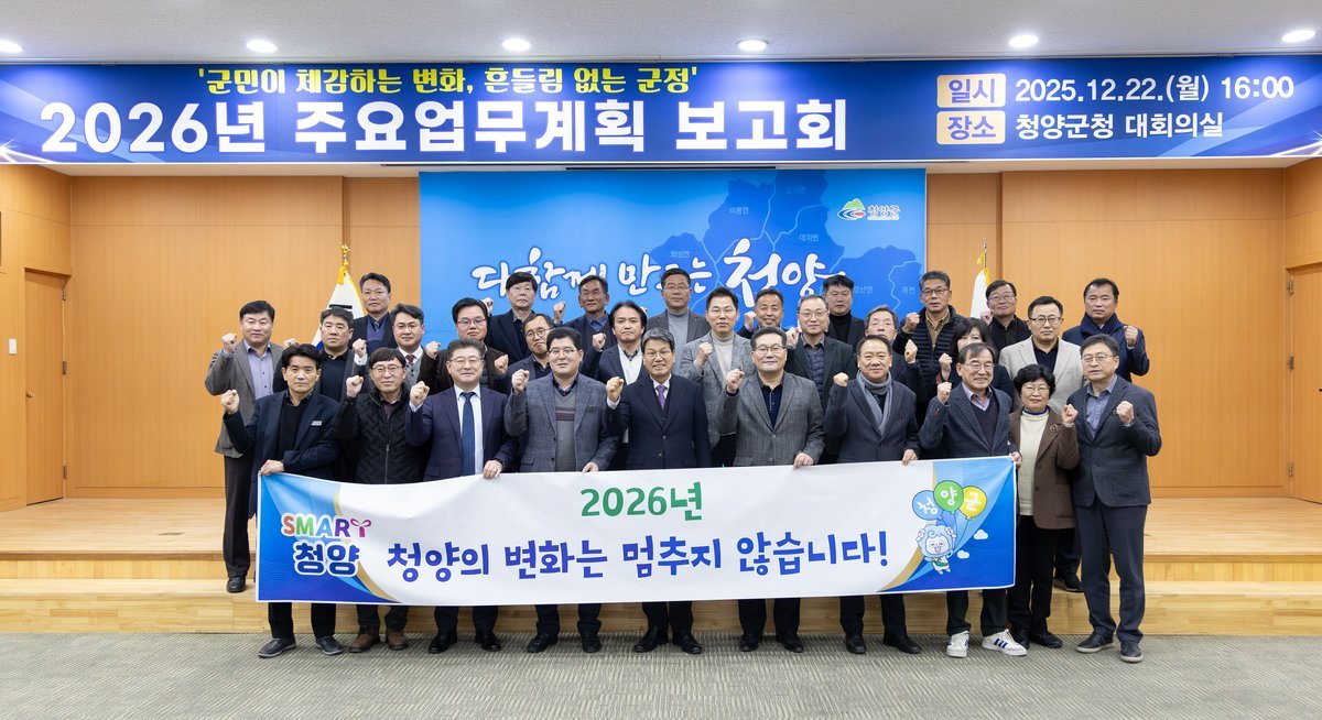 [충청뉴스큐] 청양군은 지난 22일, 군청 대회의실에서 김돈곤 군수 주재로 군청 실과・직속기관・사업소장과 10개 읍면장 및 주무팀장 등 50여 명이 참석한 가운데 ‘2026년 주요업무 추진계획 보고회’를 개최했다.