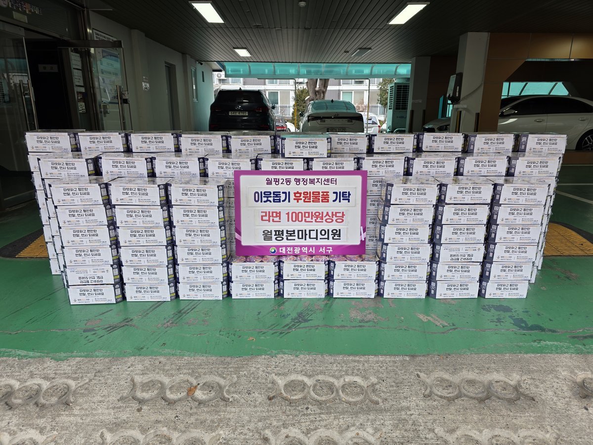 [충청뉴스큐] 대전 서구 월평2동 행정복지센터는 23일 월평동 본마디의원으로부터 어려운 이웃들을 위한 컵라면을 기탁받았다.