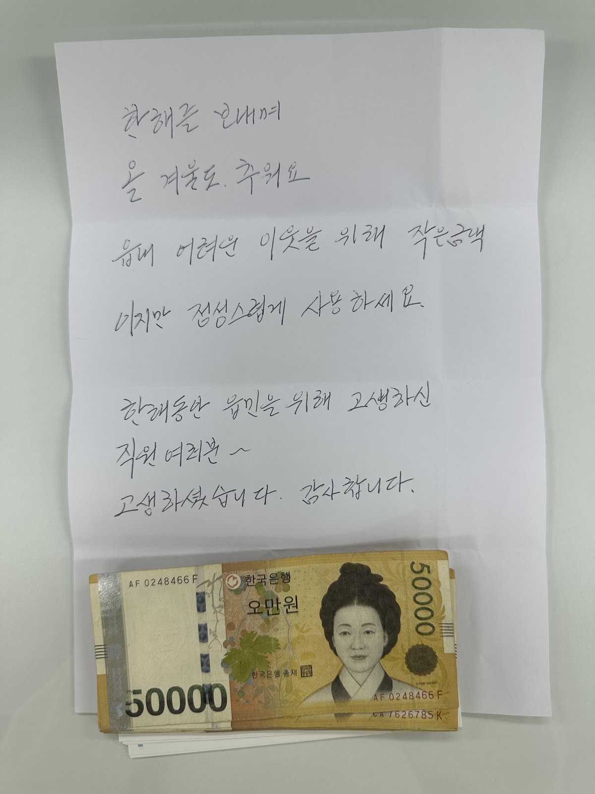편지에는 “읍내 어려운 이웃을 위해 작은 금액이지만 정성껏 사용해 달라”는 메시지가 담겼다.