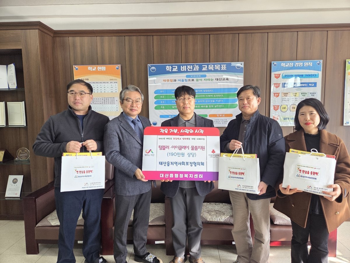 [충청뉴스큐] 대산읍지역사회보장협의체는 지난 12월 24일 대산초등학교 교무실에서 2026년 초등학교 입학생을 위한 후원물품 전달식을 가졌다.