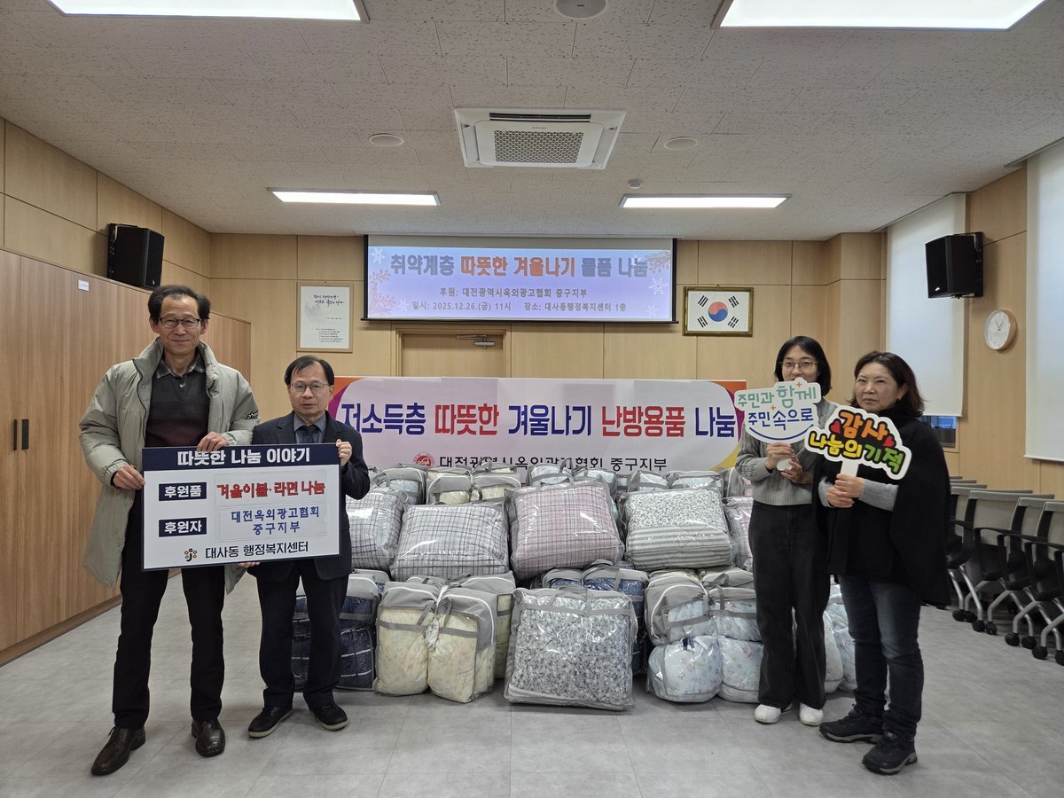 [충청뉴스큐] 대전 중구 대사동은 대전옥외광고협회 중부지부 에서 겨울이불과 라면을 기탁받았다고 28일 밝혔다.