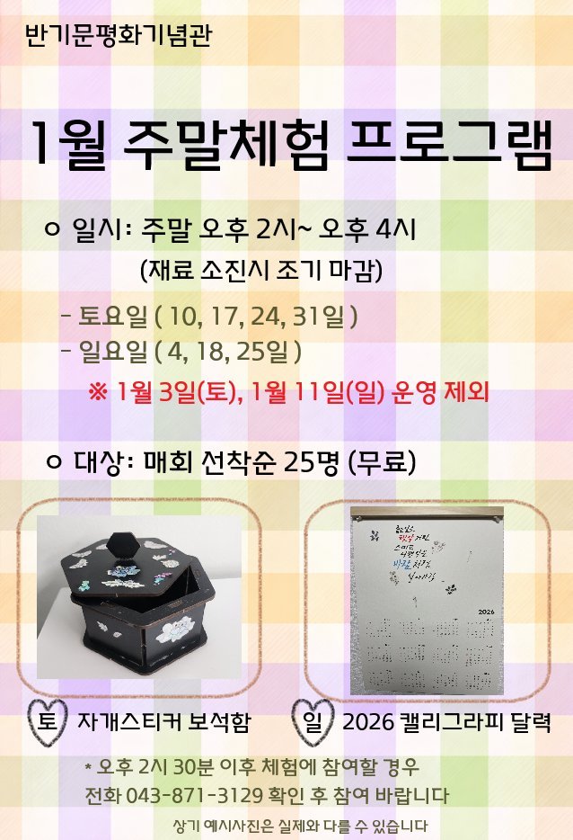 [충청뉴스큐] 음성군 제8대 유엔사무총장 반기문 평화기념관에서는 관람객을 위해 2026년 1월 주말 무료 체험 프로그램을 운영한다.