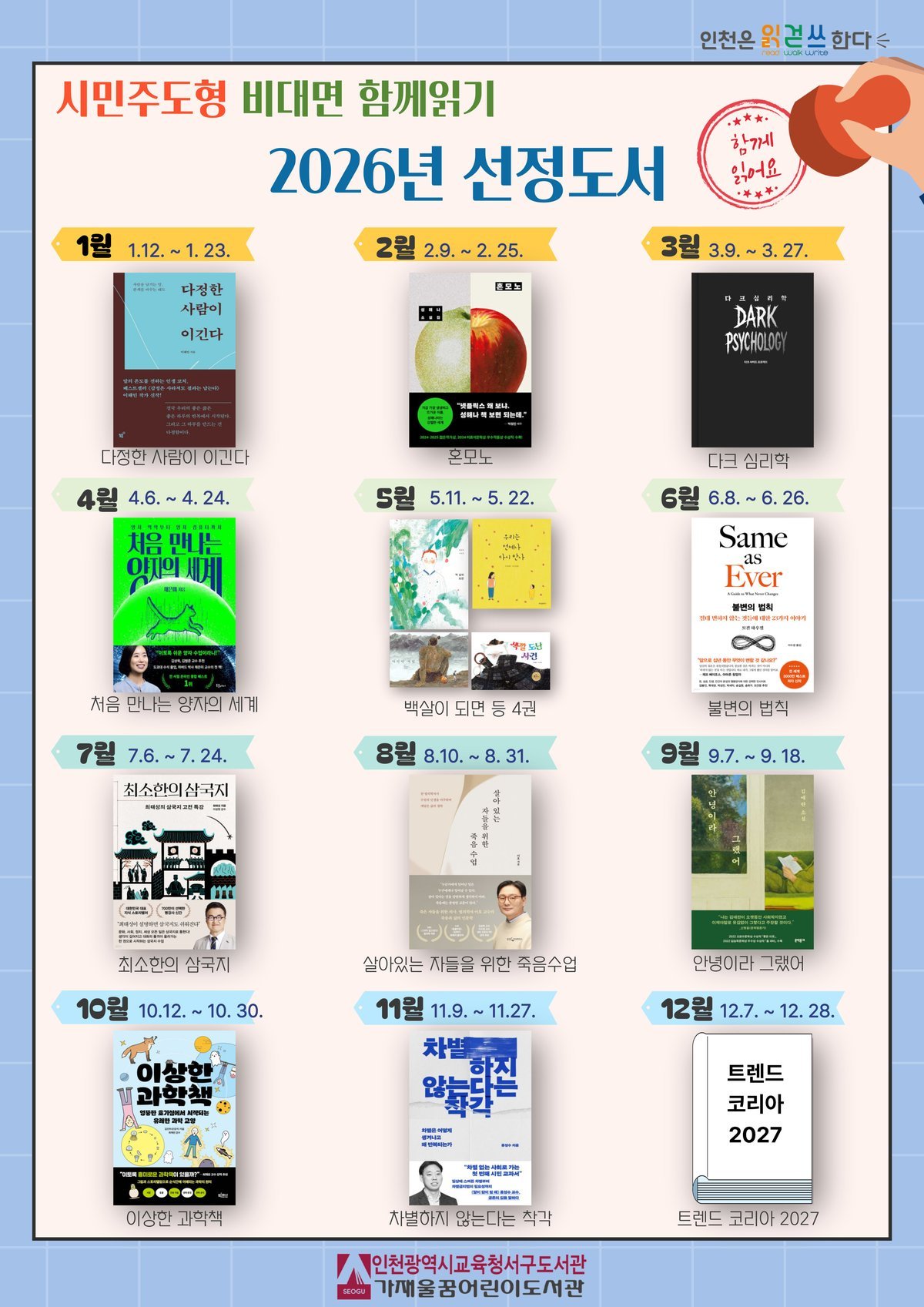 [충청뉴스큐] 인천광역시교육청서구도서관은 12월 31일 ‘2026년 시민주도형 비대면 함께읽기’도서 15권을 선정·발표했다.