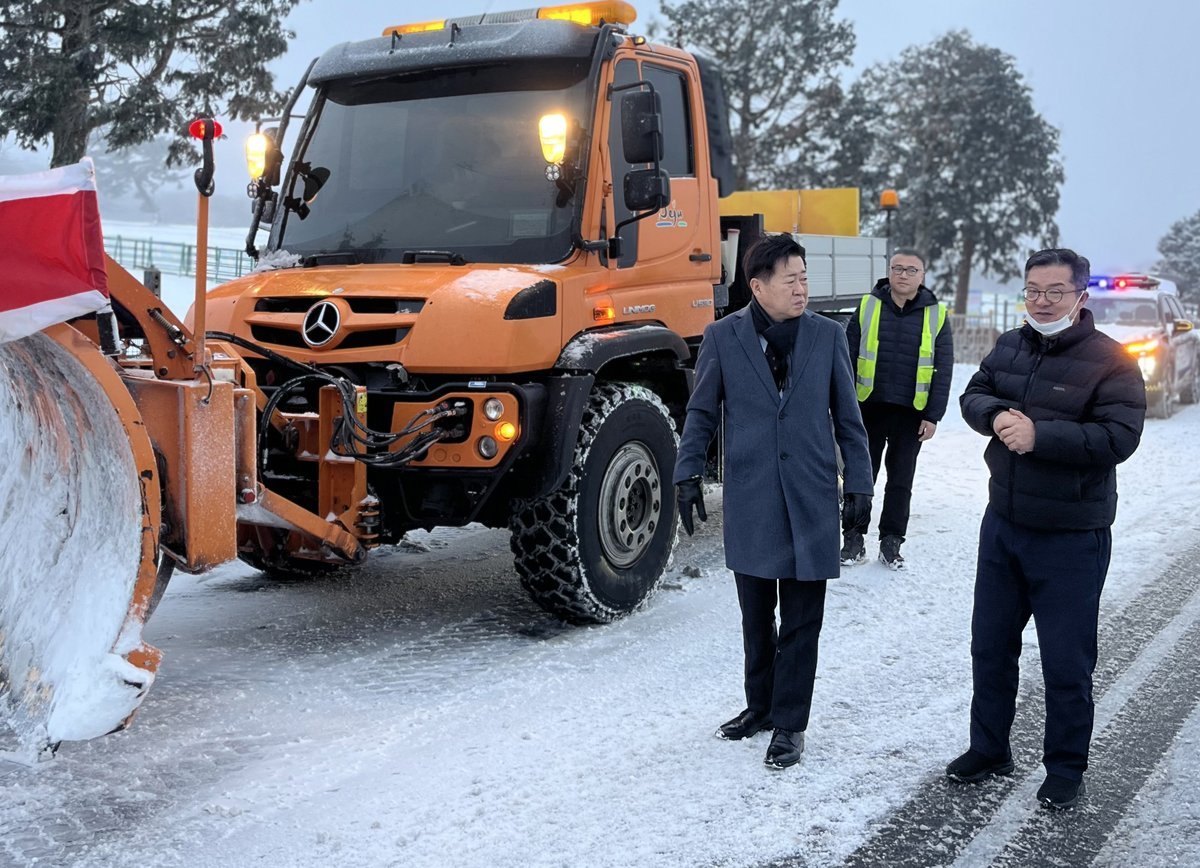 오영훈 제주도지사는 2일 오전 제주시 마방목지 일대 제설 현장을 방문해 새벽부터 근무 중인 제설 작업자들을 격려하고, 주요 산간도로 제설 상황과 현장 대응 실태를 점검했다.