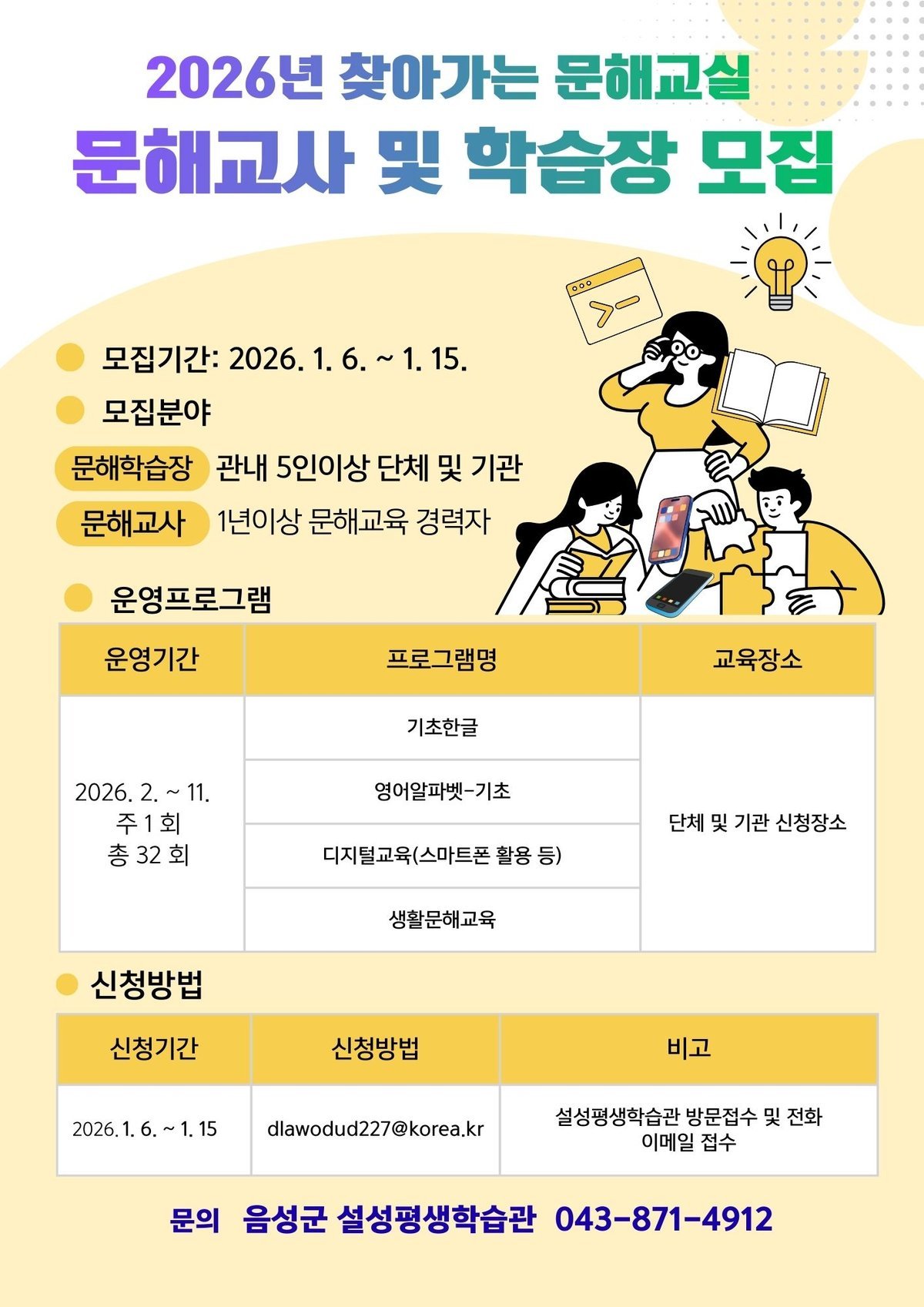[충청뉴스큐] 음성군은 성인 비문해 학습자를 대상으로 한 ‘2026년 찾아가는 문해교실’운영을 위해 문해교사와 학습장을 모집한다고 밝혔다.