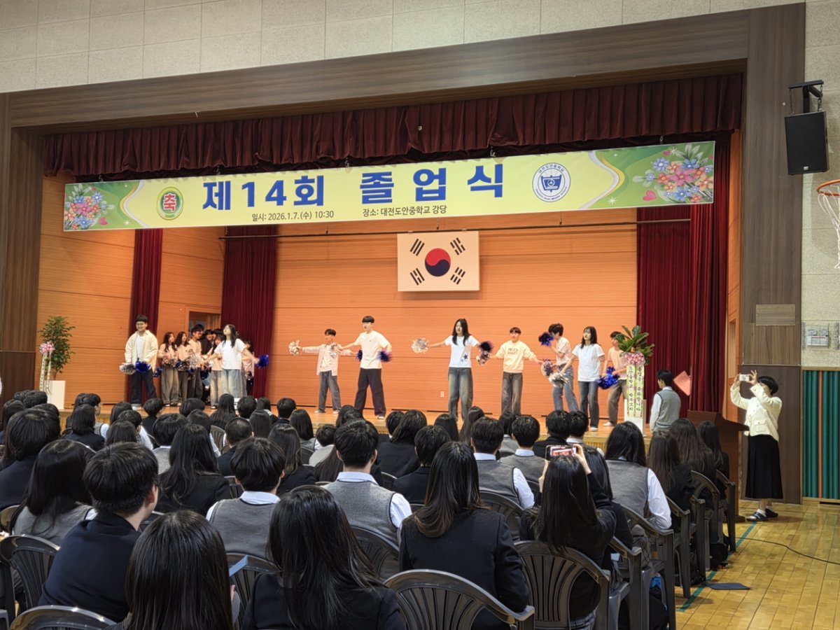 [충청뉴스큐] 대전도안중학교는 1월 7일 교내 강당에서 제14회 졸업식을 개최하고, 3년간의 중학교 과정을 성실히 마친 졸업생들의 새로운 출발을 축하했다.