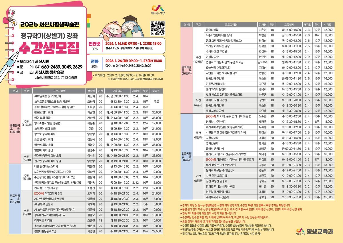 온라인 접수는 서산시 통합예약시스템을 통해 1월 16일부터 27일까지 가능하며, 전화 접수는 1월 26일부터 27일까지 서산시 평생교육과에 하면 된다.