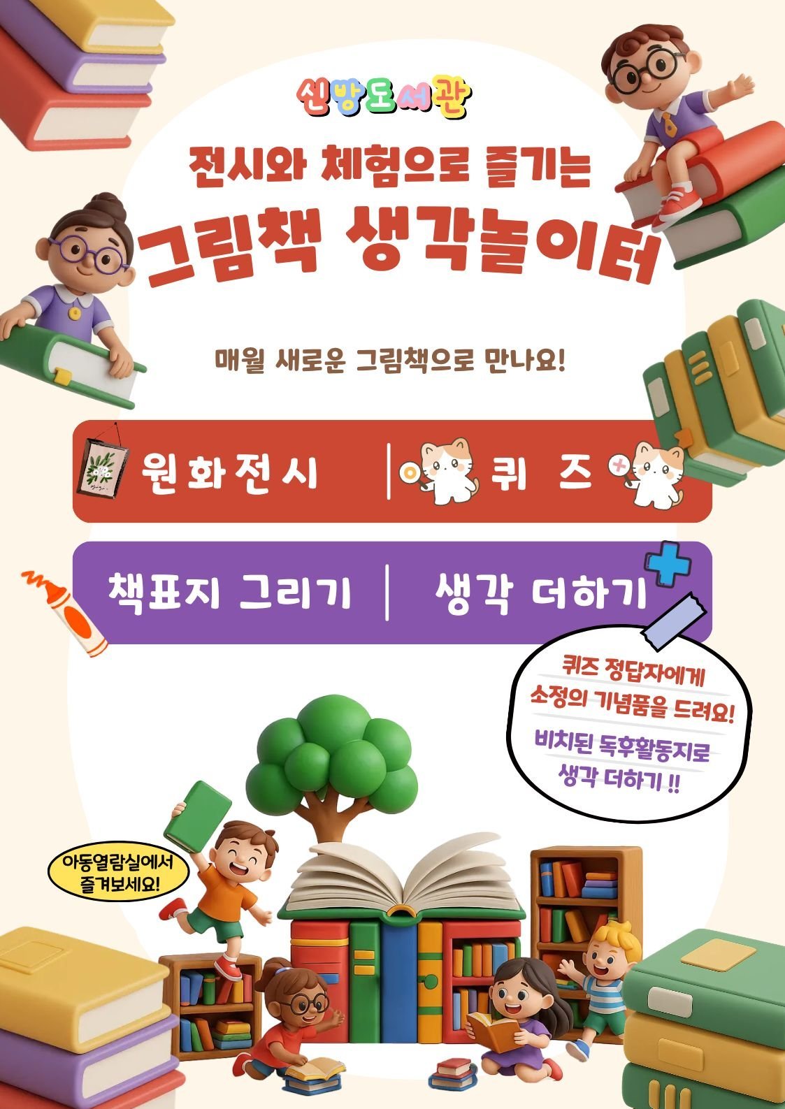 그림책 생각놀이터는 매월 새로운 그림책과 함께하는 원화 전시, 책 표지 그리기, 생각 더하기 등 다양한 체험 활동으로 운영된다.