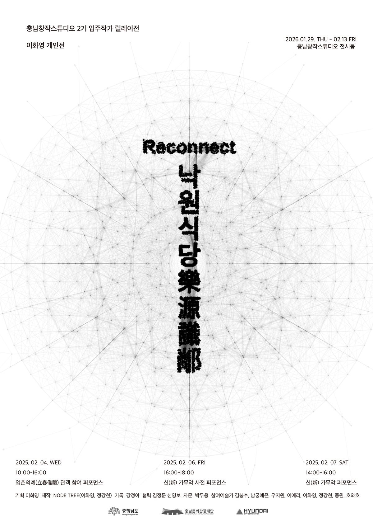배포부서 정책홍보팀 담당부서 문화사업팀 담 당 자 김혜민 주임 충남창작스튜디오, 이화영 작가 개인 릴레이 개최 - 충남창작스튜디오 7회차 릴레이전 '리커넥트:낙원식당 ''26년 1월 29일 ~ 2. 13.까지 운영 - 충남문화관광재단은 오는 1월 29일부터 2월 13일까지 충남창작스튜디오에서 입주작가 릴레이전의 일환으로 이화영 작가의 '리커넥트:낙원식당'개인전을 개최한다. 이번 릴레이전은 충남창작스튜디오 입주작가들에게 개별 전시 기회를 제공함으로써 창작 활동을 장려하고 스튜디오의 지속적인 프로그램 운영과 전시 기획을 통해 입주작가 및 공간에 대한 홍보 효과를 제고하기 위해 마련됐다. 이화영 작가의 이번 전시 'Reconnect: 낙원식당'은 일제강점기 예술인들의 거점이었던 율방 '낙원식당'을 현대적 감각으로 재해석한 작업이다. 작가의 개인적 예술 실천과 'URBAN ARCHIVE ART PROJECT TEAM NODE TREE'가 축적해 온 지역 기록을 감각적 관계망으로 엮어내며 설치 및 인터랙티브 미디어를 활용한 관객 참여형 작품을 통해 과거와 현재를 연결한다. 전시의 핵심 개념인 '신 가무악'은 노래·춤·악기가 분리되기 이전 하나의 '판'위에서 공명하던 전통적 구조를 동시대적으로 재해석한 개념이다. 전통은 재현의 대상이 아니라 기술과 몸짓, 관객의 참여가 만나 사건이 성립하는 구조로 호출되며 관객은 전시의 구성원으로 참여하게 된다. 대표작 "층위의 방주: 부재의 심연을 걷는 상징체"는 폐어구, 폐스티로폼, 스테인리스 구체와 인터랙티브 사운드를 결합한 설치 작업으로 산업 시스템이 남긴 잔여물을 통해 '사후적 진실'을 재조립한다. 관객의 촉각적 접촉을 통해 바다의 파편적 음향과 지역의 선율이 교차하며 사라진 장소의 기억이 현재로 소환된다. 이와 함께 "유연직례: 심연을 엮는 의례", "지연된 신호: 부재의 인덱스", 그리고 작가의 초기 작업 "line of tissue"가 함께 전시되어 20여 년에 걸친 작업 세계와 '기록의 계보'를 입체적으로 조망한다. 또한 이번 전시는 충남 고유의 문화 자산인 '중고제 가무악'을 현대적으로 재해석한 퍼포먼스 "Moment of Reconnect"를 운영한다. 2월 6일 오후 4시에는 '파형의 유영'을 주제로 한 열린 리허설이 진행되며 2월 7일 오후 2시에는 서해안 일대에서 수집한 미학적 파편을 엮은 본 공연 '신 가무악'이 펼쳐진다. 특히 이번 프로그램에는 승무 분야의 이애리 명인이 협업해 전통과 현대 예술이 교차하는 새로운 예술적 시도를 선보일 예정이다. 이화영 작가는 개인과 공동체, 삶과 예술의 관계를 새롭게 사유하는 뉴미디어 작업을 지속해왔다. 주요 전시 이력으로는 △위성악보 시리즈 '국경', 신동엽문학관, 부여 △위성악보 시리즈 'KARMA', 부소갤러리, 부여 △'고속화도로 로망스'전시·공연, 경기상상캠퍼스, 수원 등이 있다.