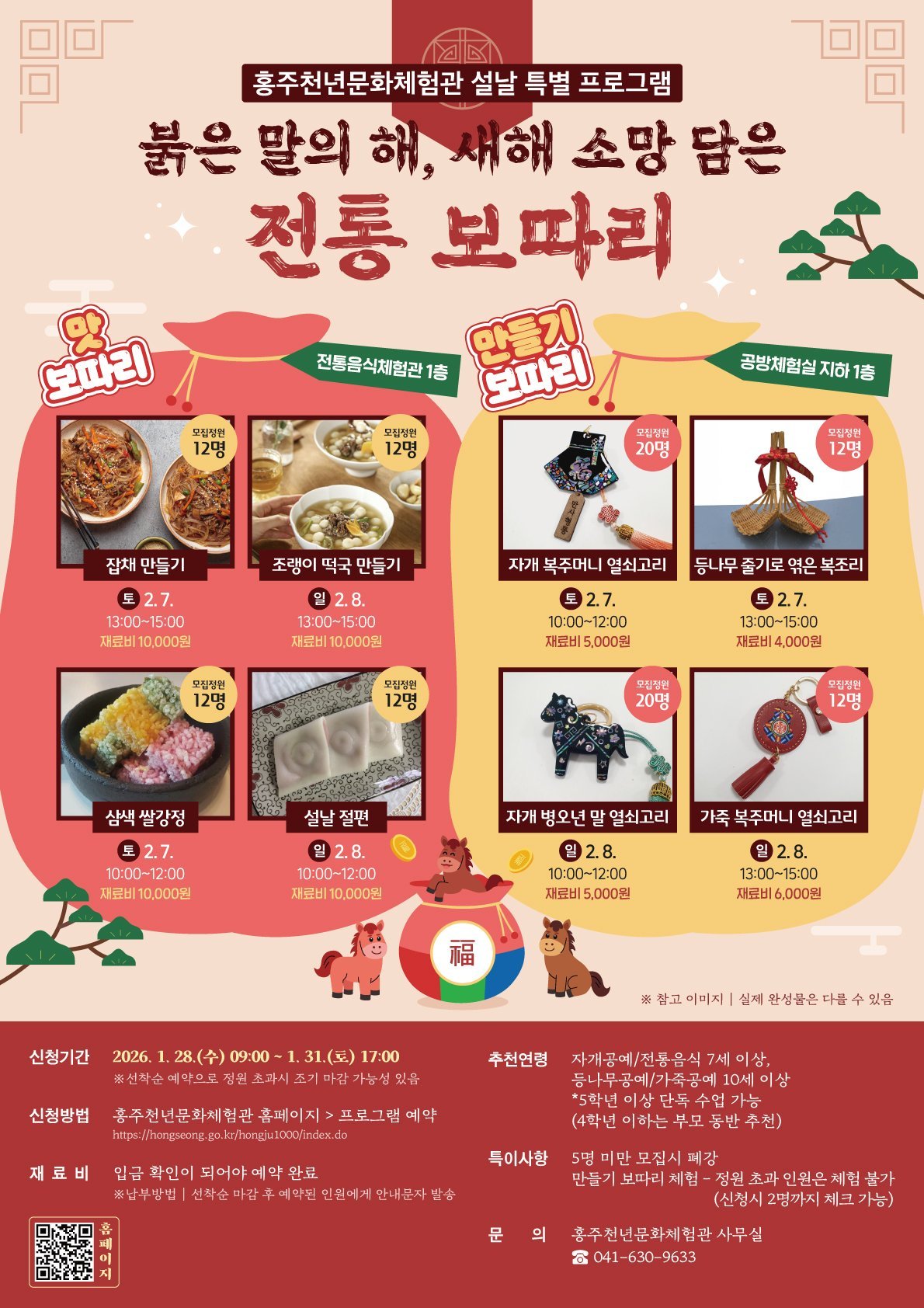 [충청뉴스큐] 홍성군 홍주천년문화체험관은 붉은 말의 해를 맞이해 설날 특별 프로그램 ‘붉은 말의 해, 새해 소망 담은 전통 보따리’를 다음달 7일부터 8일까지 이틀간 운영한다.