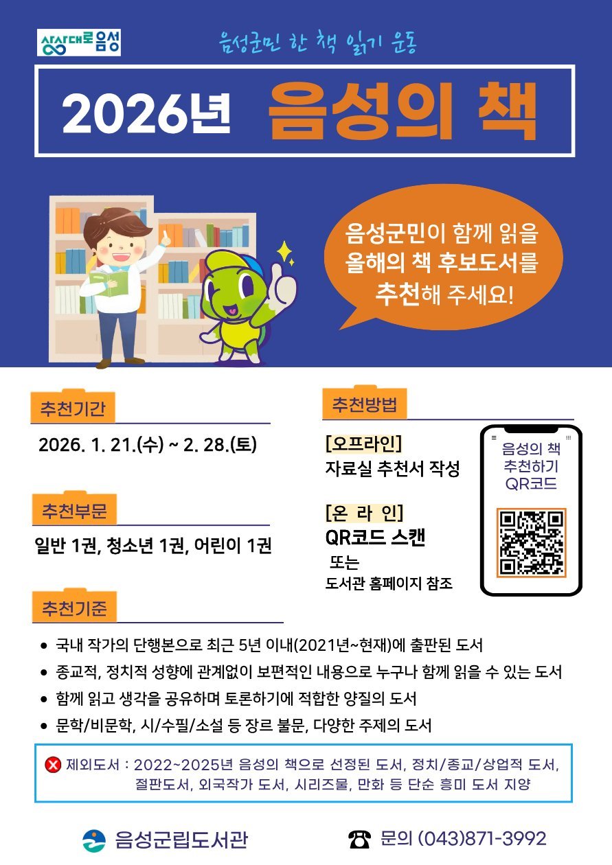 군 관계자는 “군민 여러분의 추천으로 만들어지는 2026년 음성의 책 사업에 많은 관심과 참여를 부탁드린다”며 “전 군민이 함께 읽고 이야기 나누며 공감하는 소중한 독서 경험을 해보시길 바란다”고 말했다.