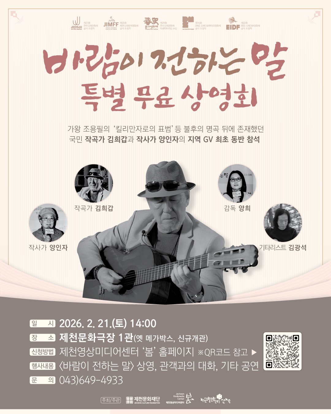 [충청뉴스큐] 제천문화재단이 오는 2월 21일 오후 2시, 제천문화극장 에서 양희 감독과 출연진이 함께 하는 ‘바람이 전하는 말’특별 무료 상영회를 개최한다.