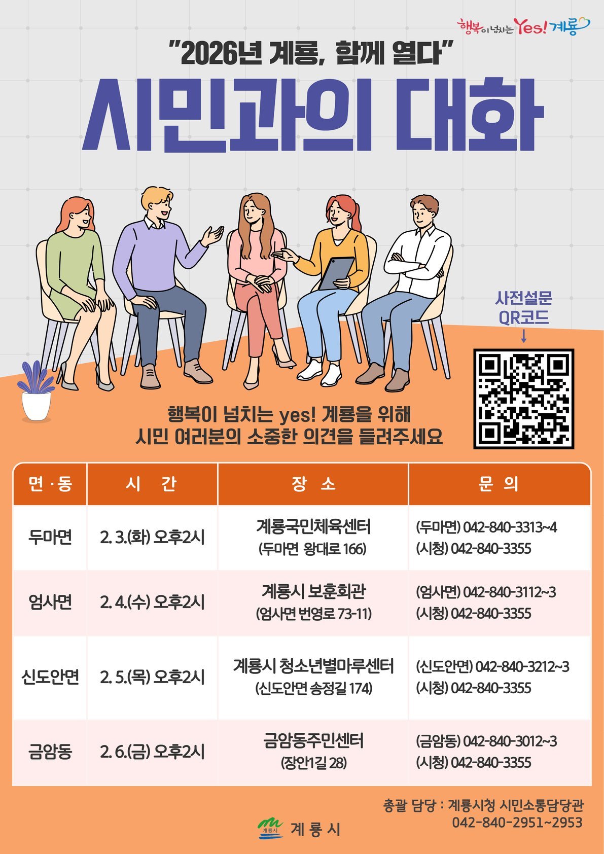 시 관계자는 "시민과의 대화는 시정의 출발점이자 가장 중요한 소통 창구"며 "시민 한 분 한 분의 소중한 의견이 계룡의 미래를 여는 밑거름이 될 수 있도록 열린 자세로 경청하고 시정에 충실히 반영하겠다"고 말했다.