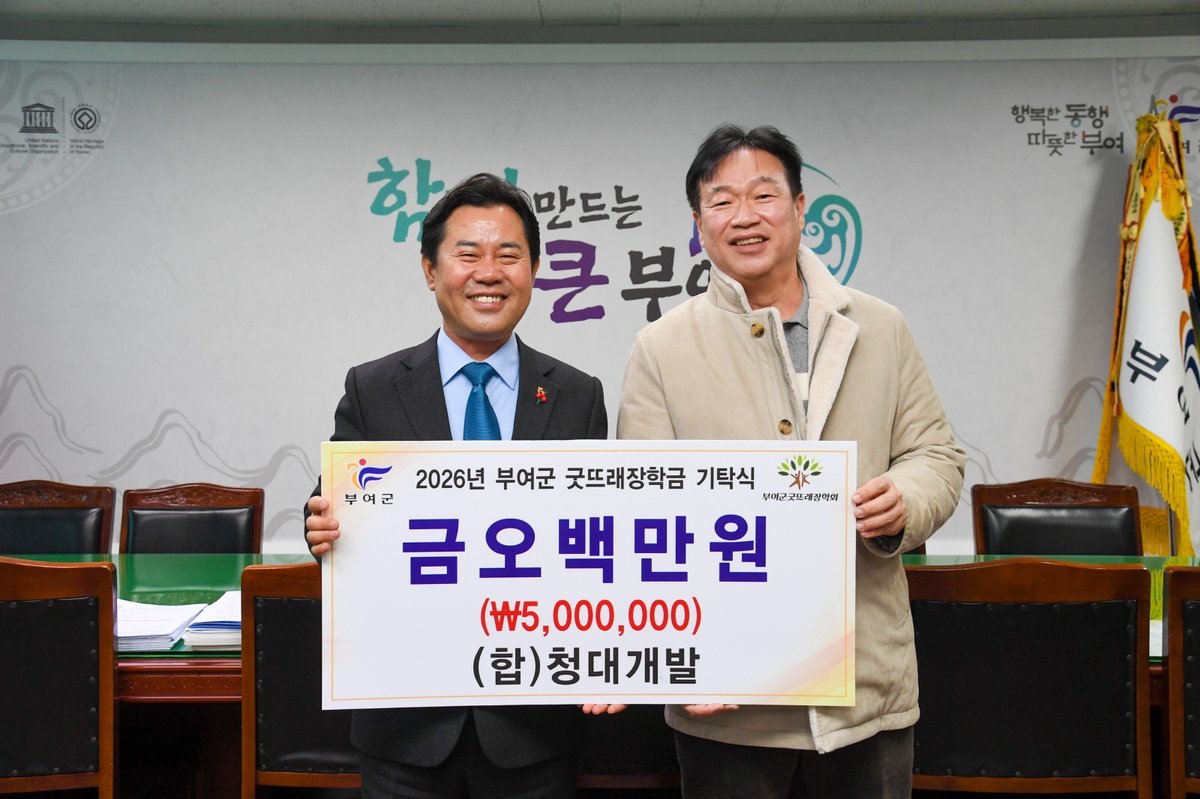 [충청뉴스큐] 부여군은 규암면에 소재한 청대개발이 인재 육성을 위한 장학금 5백만원을 부여군굿뜨래장학회에 기탁했다고 27일 밝혔다.