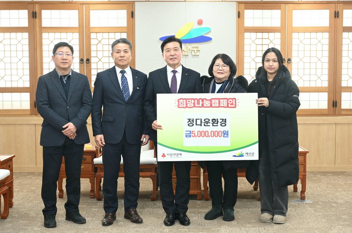 [충청뉴스큐] 예산군은 지난 27일 군청 상황실에서 정다운환경이 ‘희망2026 나눔캠페인’이웃사랑 성금 500만원을 기탁했다고 밝혔다.
