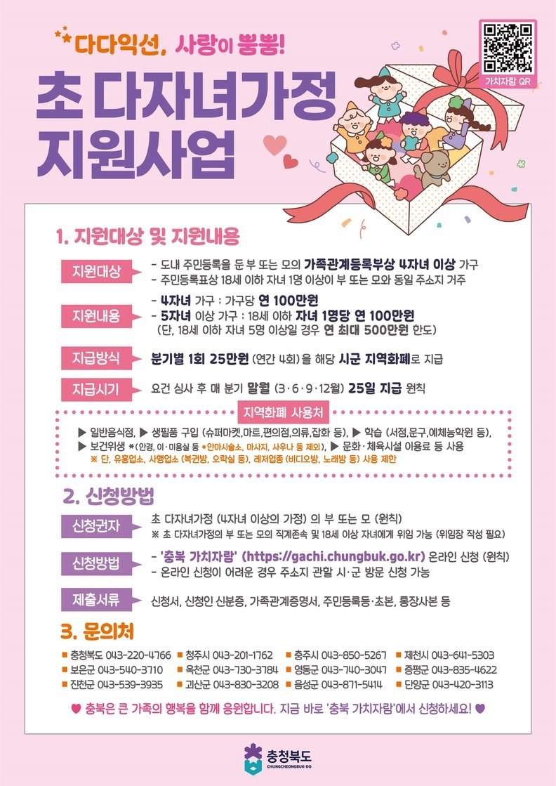 충주시청 관계자는 “이번 지원사업 확대를 통해 4자녀 가구도 경제적 부담을 덜고 자녀 양육에 실질적인 도움을 받을 수 있을 것으로 기대한다”며 “많은 가정이 신청해 혜택을 누리길 바란다”고 말했다.
