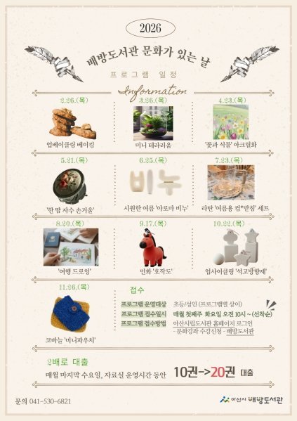 프로그램 참여 신청은 매월 첫째 주 화요일 10시부터 아산시립도서관 누리집을 통해 선착순으로 접수하며 자세한 사항은 도서관 누리집을 확인하거나 배방도서관로 문의하면 된다.