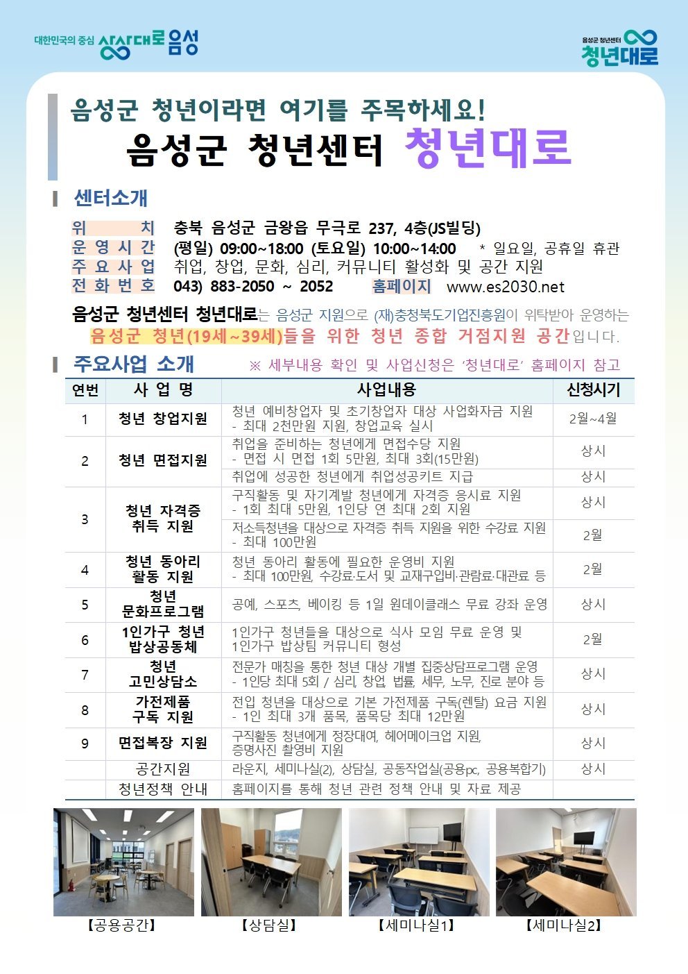 [충청뉴스큐] 음성군의 청년지원정책 추진 거점공간인 음성군 청년센터 ‘청년대로’는 2월부터 청년지원 프로그램을 본격적으로 운영한다고 밝혔다.