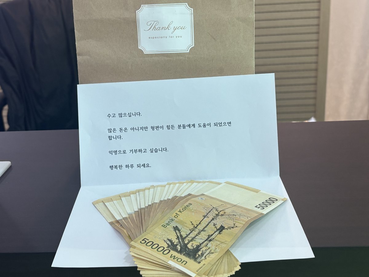 특히 기부자는 현장을 떠나며 “수고 많으십니다. 많은 돈은 아니지만 형편이 힘든 분들에게 도움이 되었으면 한다. 익명으로 기부하고 싶습니다. 행복한 하루 되세요”라는 짧지만 진심 어린 편지를 남겨, 현장에 있던 직원들과 주변 이들에게 큰 감동을 선사했다.
