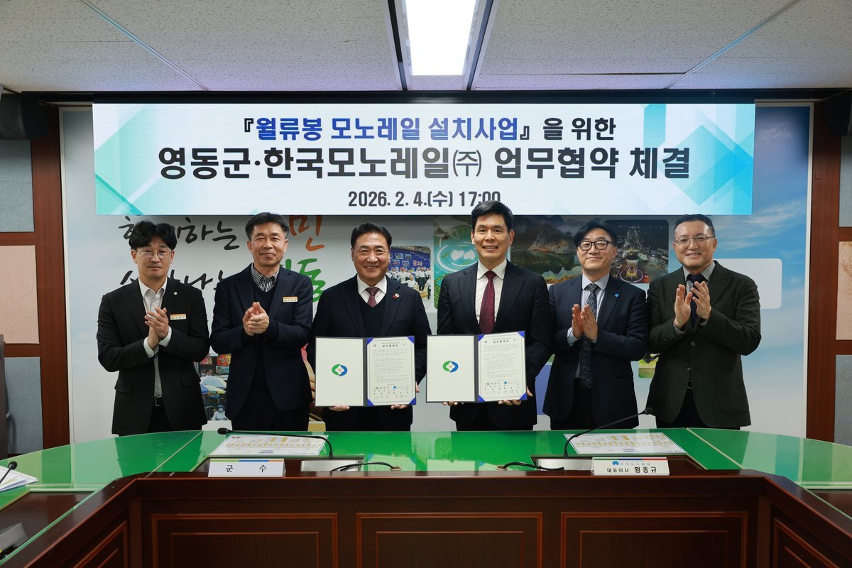 영동군은 4일 오후 군청 상황실에서 한국모노레일㈜과 월류봉 모노레일 설치를 위한 업무협약을 체결하고 민·관 협력을 바탕으로 관광 인프라를 확충해 체류형 관광 활성화에 나선다고 밝혔다.