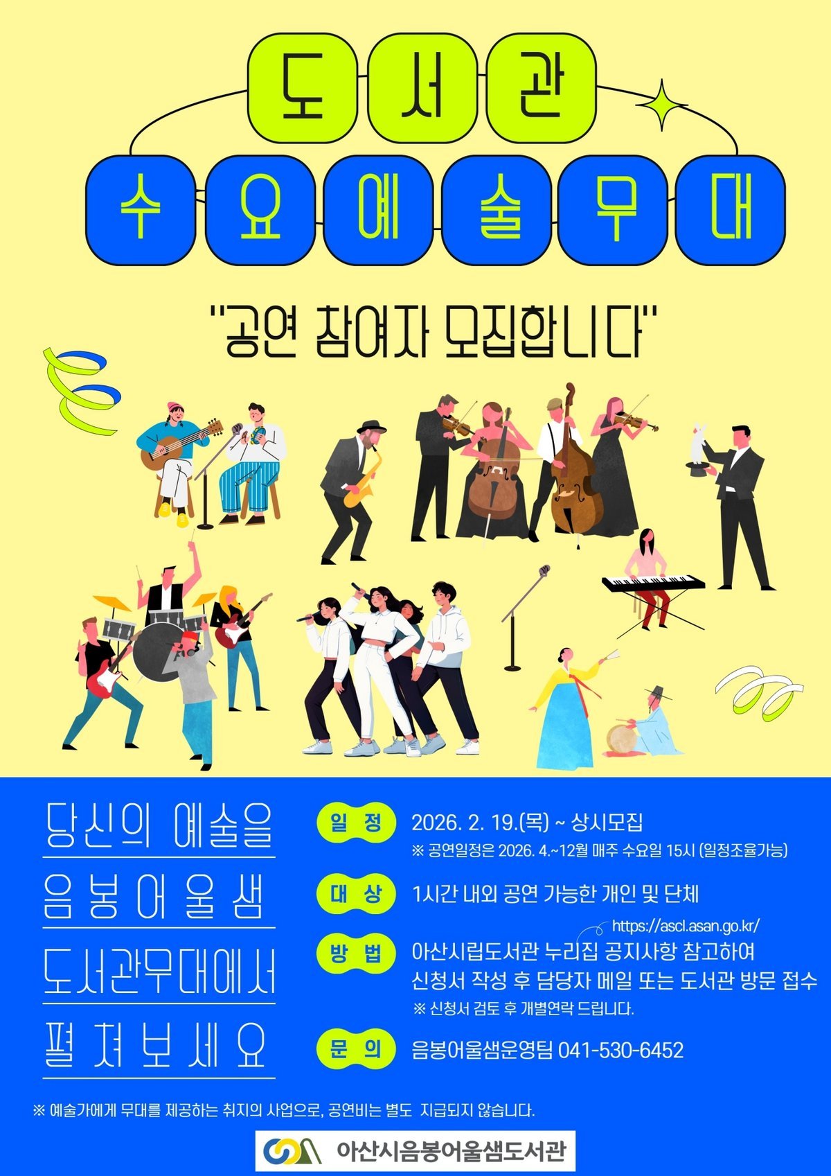 [충청뉴스큐] 아산시는 시민과 함께 즐길 수 있는 다양한 공연 활동을 도서관 공간에서 선보이는 ‘도서관 수요예술무대’를 운영하고 2026년 프로그램에 참여할 예술인과 단체를 상시 모집한다고 밝혔다.