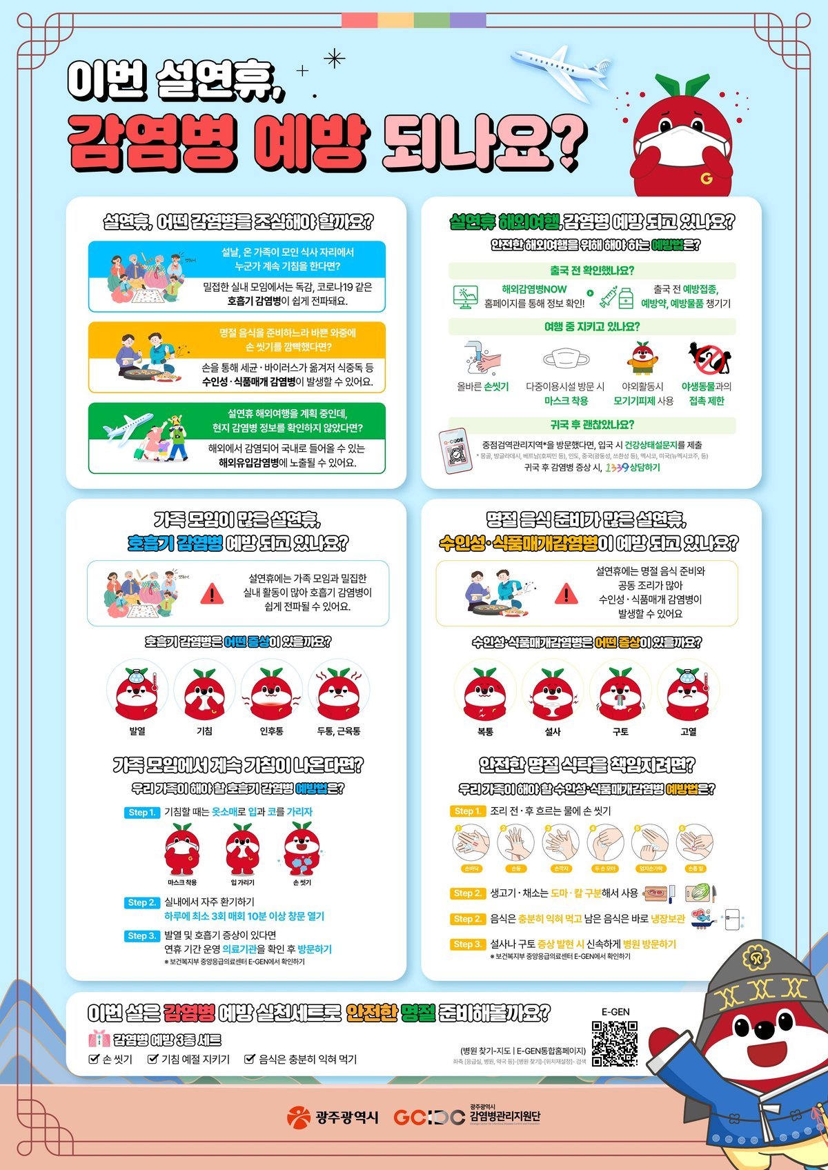 광주시는 특히 인플루엔자 예방을 위해 어르신·임신부·어린이·청소년을 대상으로 설 연휴 전 예방접종을 권장했다. 아울러 발열, 설사, 구토 등 감염병 증상이 발생한 경우 가까운 의료기관에서 진료를 받아야 한다고 강조했다.