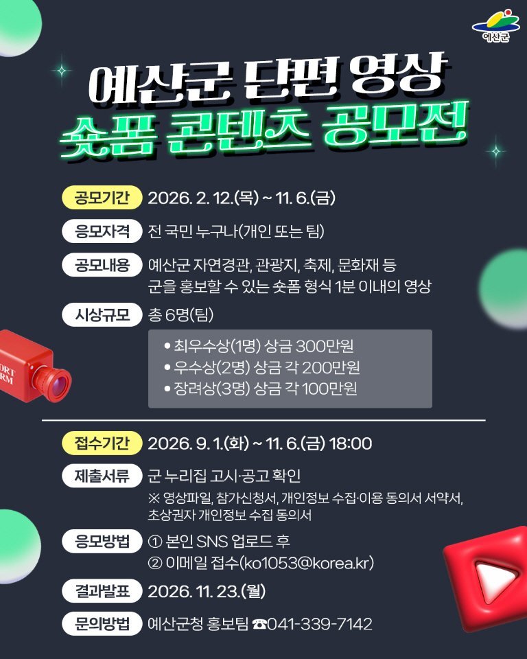 [충청뉴스큐] 예산군은 지역의 숨은 매력을 담은 단편 영상 콘텐츠 발굴을 위해 ‘예산군 숏폼 콘텐츠 공모전’을 개최한다고 12일 밝혔다.