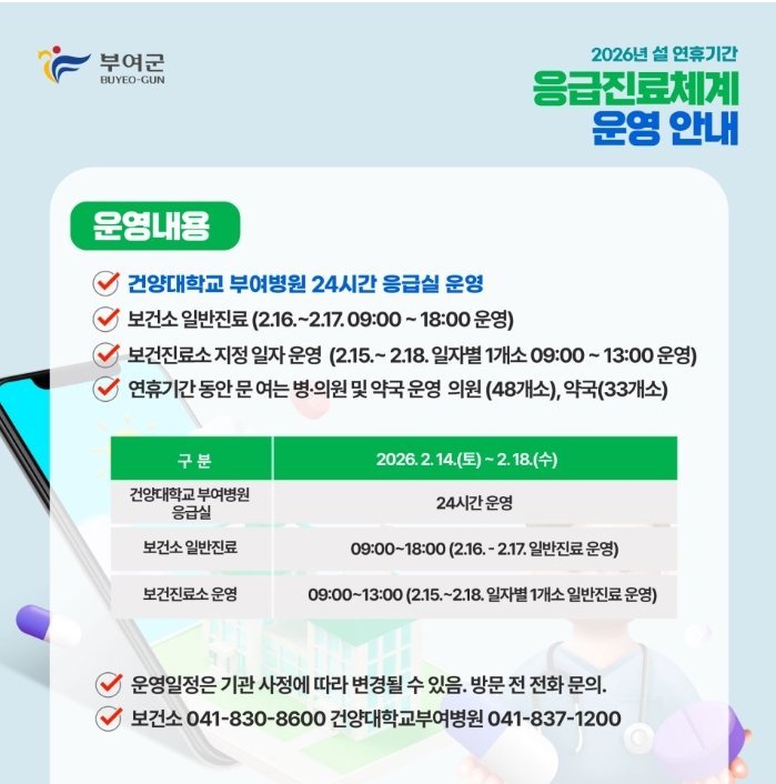 또한, 2월 16일과 설날 당일에는 부여군보건소에서 일반진료를 정상 운영 한다.