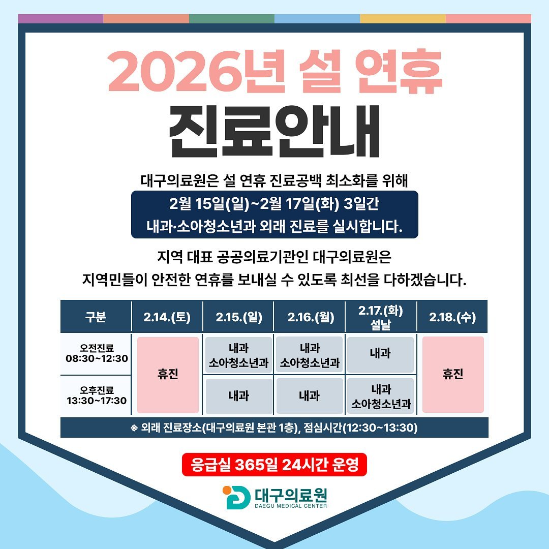 ‘대구의료원 2026년 설 연휴 진료 현황’구 분 2.14년 2월 15일 2.16년 2월 17일 설날 2.18. 오전 08:30⁓12:30 휴진 내과, 소아청소년과 내과, 소아청소년과 내과 휴진 오후 13:30⁓17:30 내과 내과 내과, 소아청소년과 진료장소 대구의료원 본관 1층, 응급실 365일 24시간 운영 또한, 인근 약국 4개소와 협력해 설 연휴 기간 외래 진료 후에도 약을 처방받을 수 있도록 대비했다.