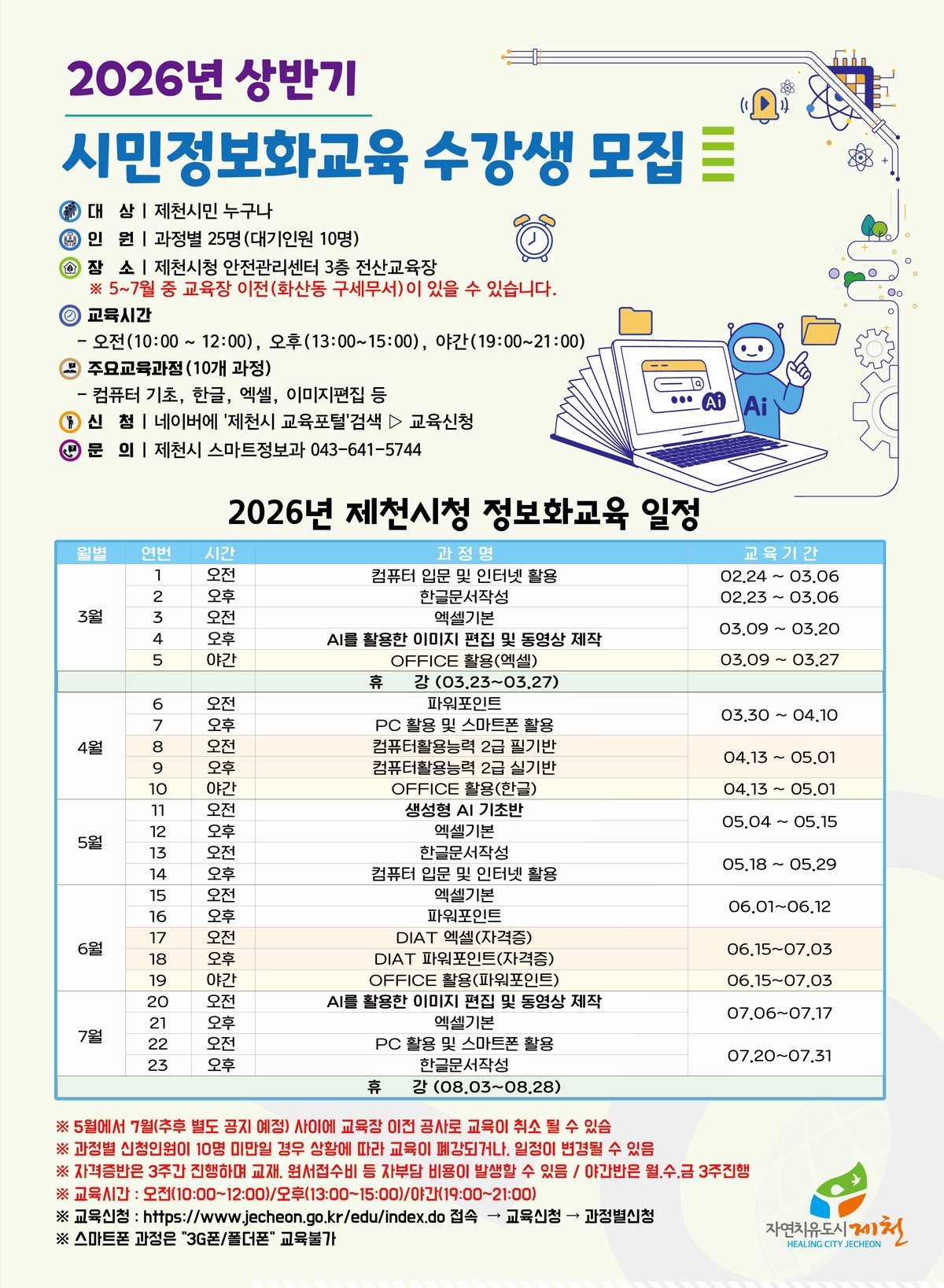 [충청뉴스큐] 제천시는 시민들의 디지털 정보격차 해소와 미래 역량 강화를 위해 ‘2026년 시민 정보화교육’전 과정을 무료로 운영한다고 밝혔다.