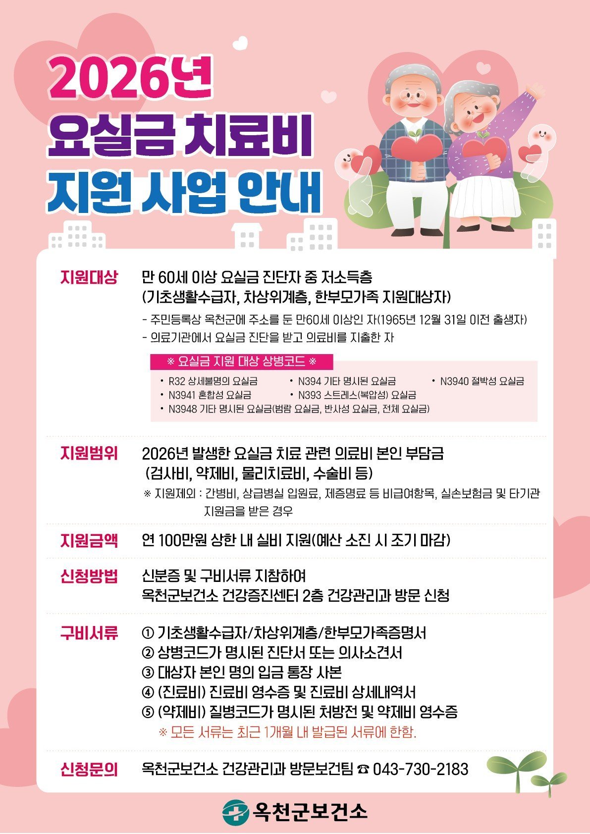 지원 대상은 옥천군에 주소를 둔 만 60세 이상으로 기초생활수급자, 차상위계층, 한부모가족 중 하나에 해당하면서 의료기관에서 요실금 진단을 받고 의료비를 지출한 군민이다.