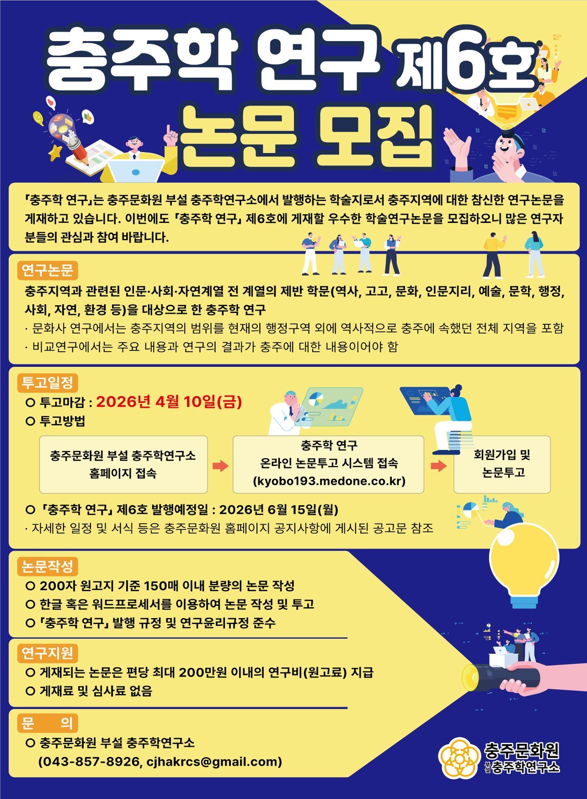 올해에도 '충주학 연구'제6호에 실릴 충주학 연구논문과 함께 새로운 연구자들의 충주학 학술연구과제를 지원하는 2026년 충주학 신진연구자 학술연구과제 공모를 추진한다.