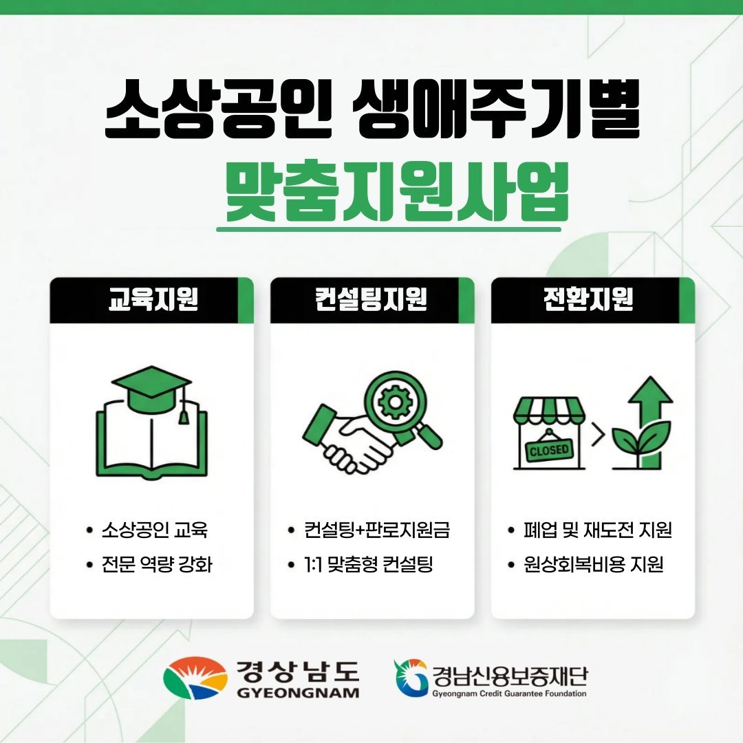 [충청뉴스큐] 경상남도는 경기침체와 소비 위축 등 어려운 경영 환경 속에서 도내 소상공인의 경쟁력 강화를 위해 ‘소상공인 생애주기별 맞춤 지원사업’을 추진한다고 밝혔다.