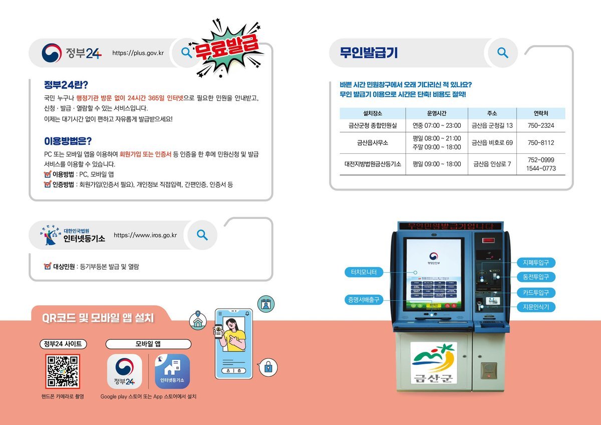 무인민원발급기는 읍면 행정복지센터를 비롯해 금산군청 종합민원실, 대전지방법원 금산등기소 등에 설치돼 있으며 평일 오전 9시부터 오후 9시까지 이용할 수 있고 수수료는 창구 수수료의 50%다.