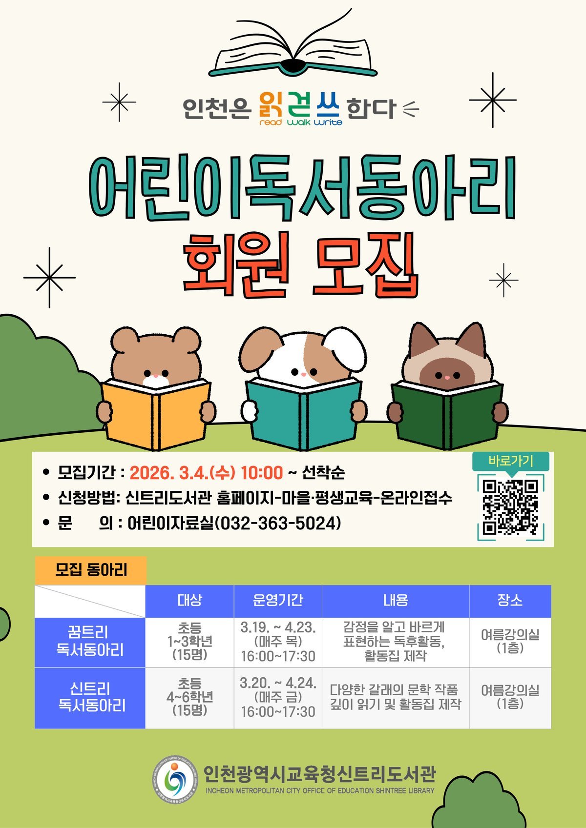 [충청뉴스큐] 인천광역시교육청신트리도서관은 오는 3월 4일부터 ‘어린이 독서동아리’참여자를 모집한다.