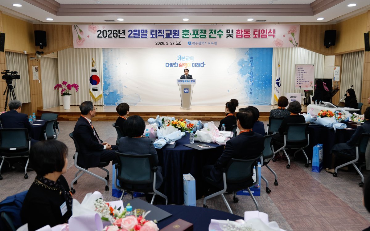 [충청뉴스큐] 광주시교육청은 27일 본청 대회의실에서 2월 말 정년퇴직 교원과 8월 말 명예퇴직 예정 교원이 참석한 가운데 '퇴직교원 훈, 포장 전수 및 합동 퇴임식'을 개최했다.