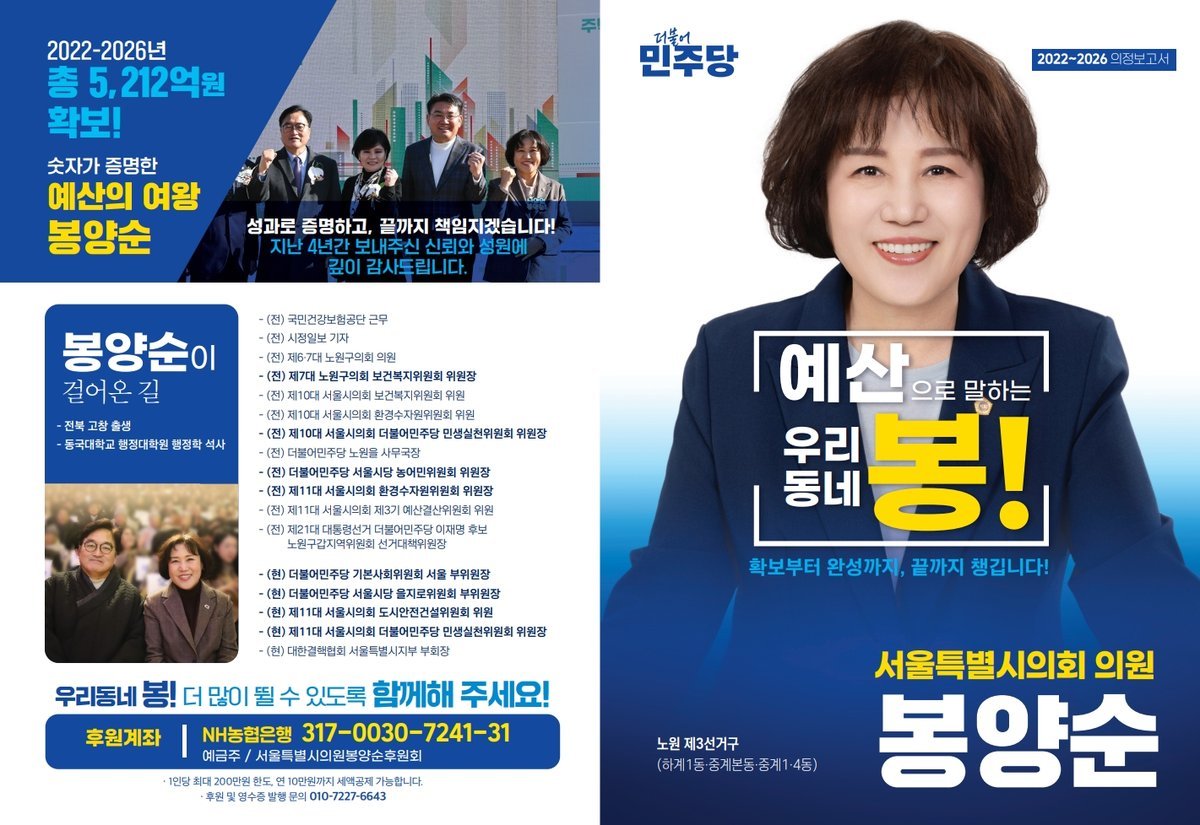 봉양순 의원은 "지난 4년은 주민 여러분의 신뢰와 협력 속에서 가능했다"며 "앞으로도 지역발전을 위해 생활 가까이에서 체감할 수 있는 변화를 만드는 의정활동을 이어가겠다"고 밝혔다.