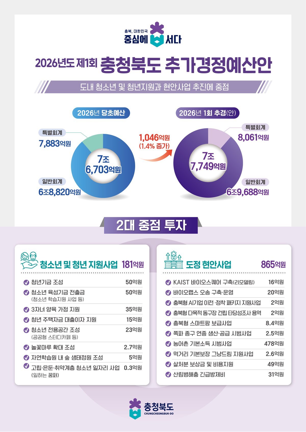 청소년 및 청년 지원 - 청년기금 조성 50억원 - 청소년 육성기금 전출금 50억원 - 3자녀 양육 가정 지원 35억원 - 청년 주택자금 대출이자 지원 15억원 - 청소년 전용공간 조성 23억원 - 놀꽃마루 확대 조성 및 운영 2.7억원 - 자연학습원 내 숲생태정원 조성 5억원 - 고립 은둔 취약계층 청소년 일자리 사업 0.3억원 도정 현안사업 추진 : 865억 미래 첨단산업 육성을 위한 KAIST 바이오 스퀘어 구축 16억원, 바이오랩스 오송 구축 운영 20억원, 충북형 AI기업 이전 정착 패키지 지원 2억원을 신규 편성했다.