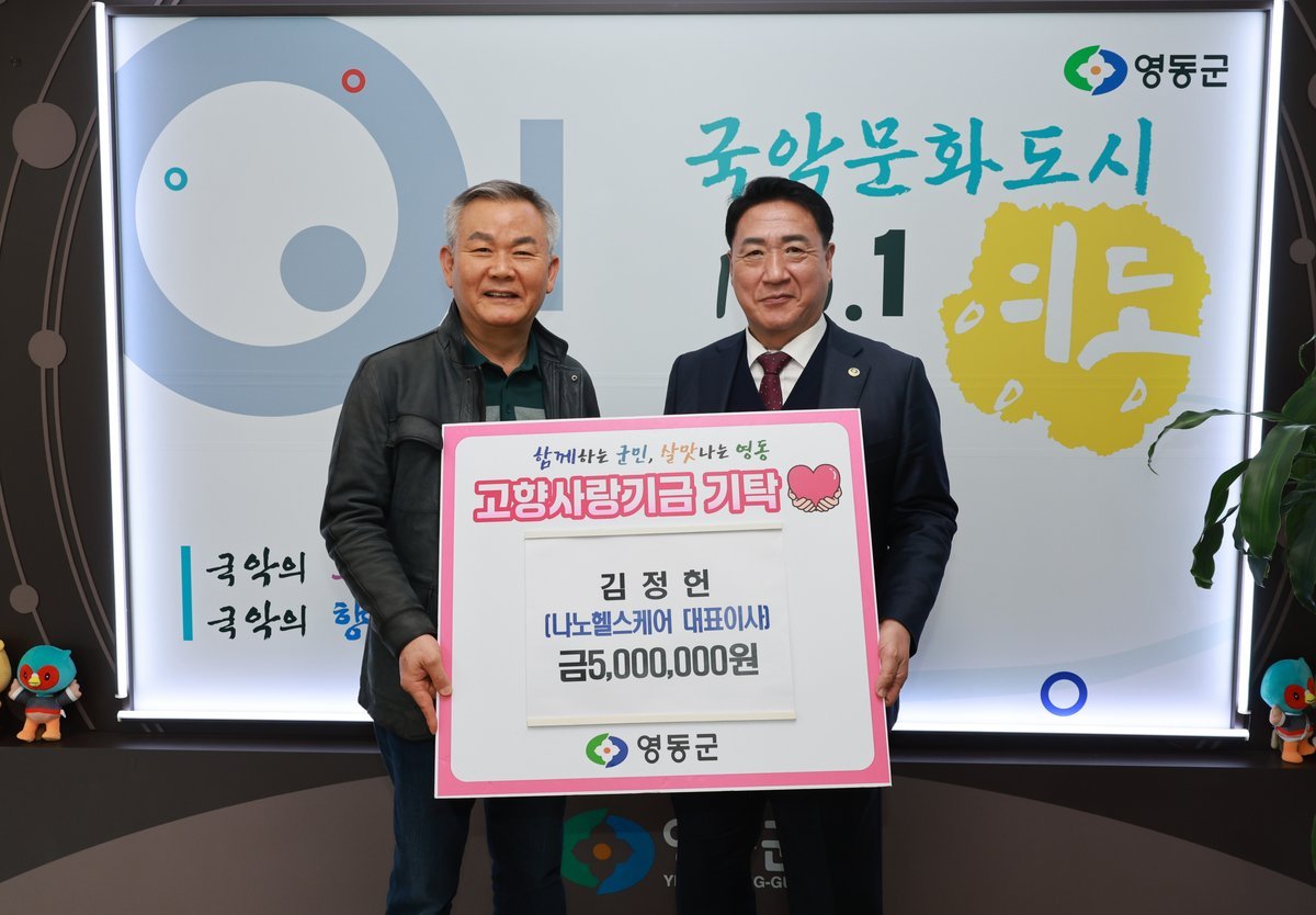 [충청뉴스큐] 나노헬스케어 김정헌 대표가 5일 영동군청을 찾아 500만원의 기부금을 전달하며 고향사랑기부제에 동참했다.
