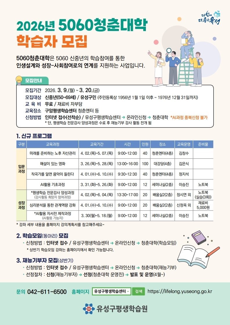 [충청뉴스큐] 대전 유성구는 50~69세 신중년을 대상으로 '5060청춘대학'을 운영한다.